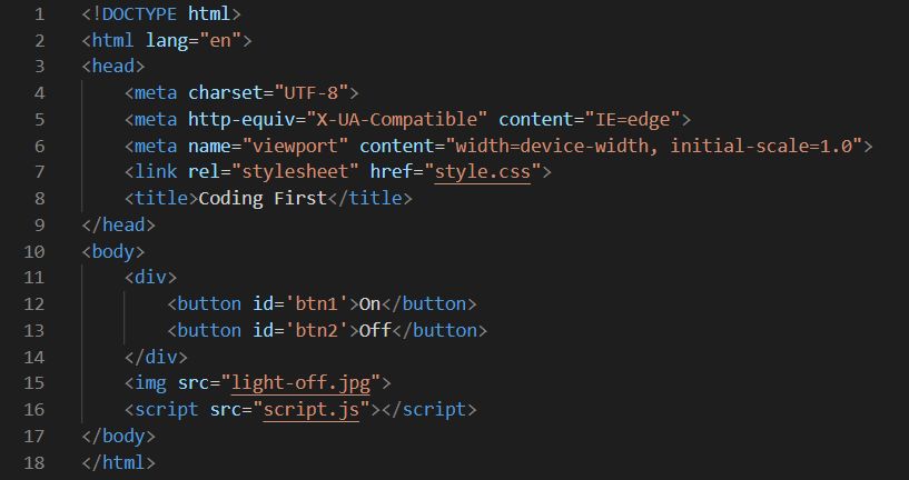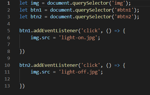 - Creates variables img, btn1, and btn2 to be called in the JavaScript code using the CSS selectors or Ids: img, #btn1 ('On'), #btn2 ('Off').